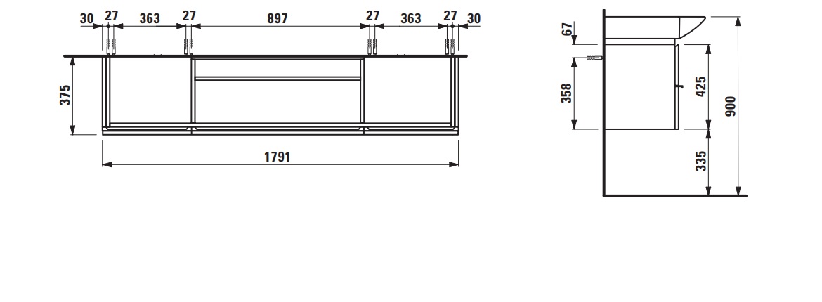 2 выдвижных ящика с 2 дверцами, 2 стеклянные полки
